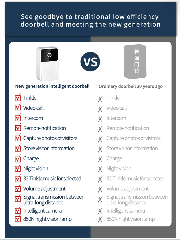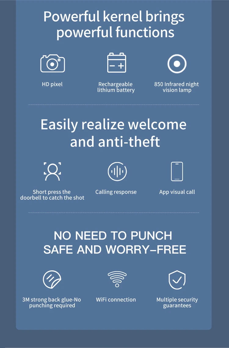 • Wireless Connection :No need for complicated wiring, the doorbell connects wirelessly to your home network.